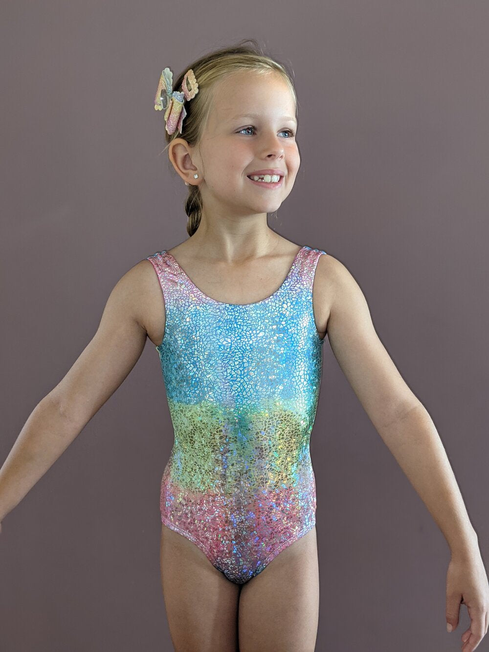 This gorgeous pastel rainbow hologram fabric looks super adorable in our bowtastic leotard design.