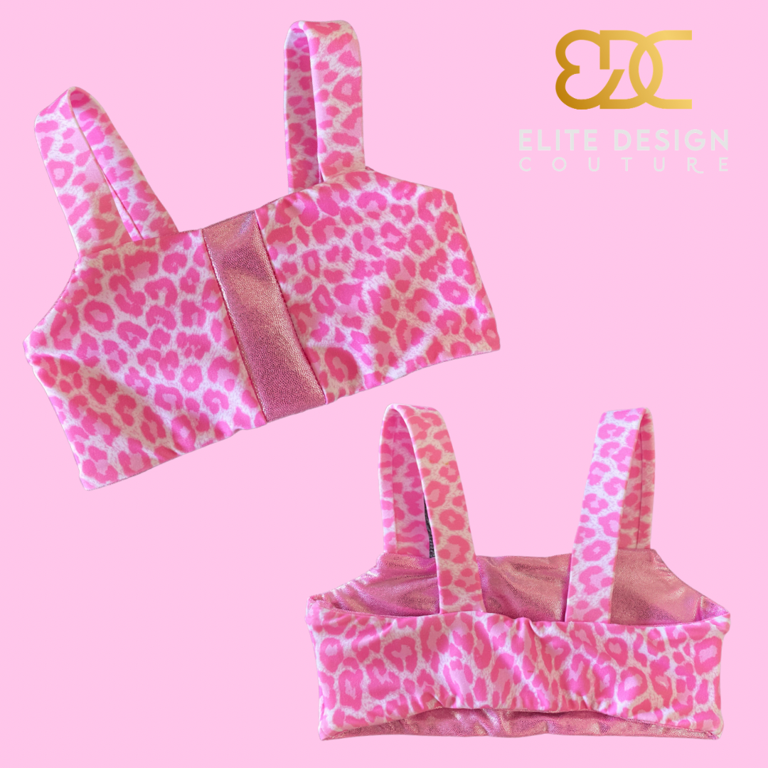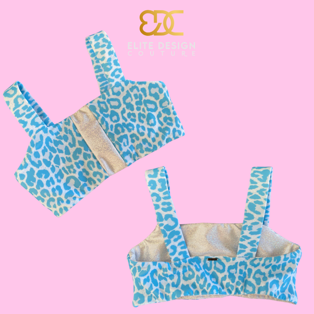 Reversible crop. Your choice between Pink, Blue or Black cheetah with matching foil spandex.